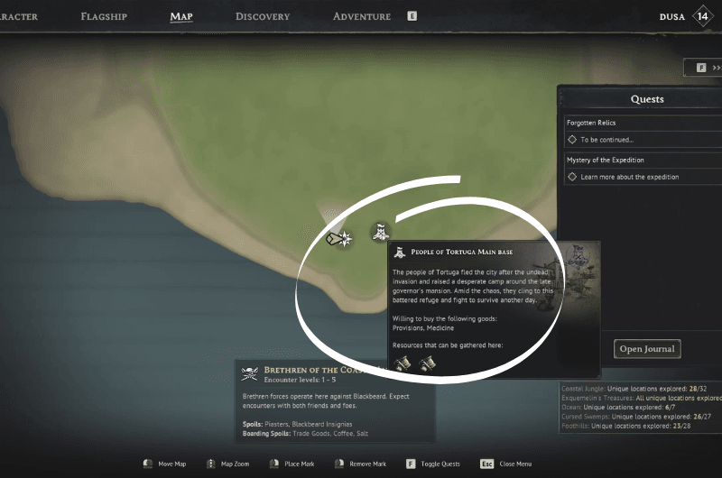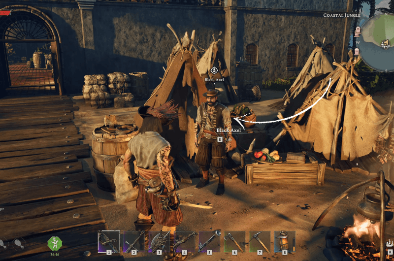 To hire Black Axel, you need to travel to the People of Tortuga Base and you’ll find Black Axel just outside the building near the cooking area as shown in the above images. He is a cook, so he offers a 30% chance to cook an extra portion.