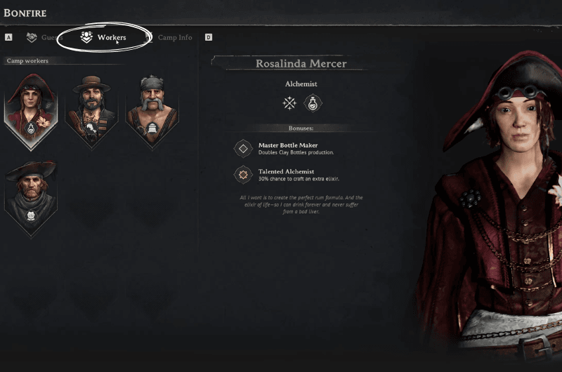 Her name is Rosalinda Mercer and she’s an alchemist. Hiring her and assigning at your base is going to grant you a 30% chance for crafting an extra elixir. Interact with them and you’ll get an option to hire them by paying them 500 Piastre.