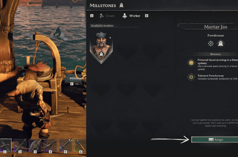 I don’t remember where I’ve found Mortar Joe, but it must be one of the safe havens as I’ve said before. Mortar Joe can be assigned at the Millstones, he increases your Gunpowder production by 50% and he also has a personal quest that will probably be in future game updates.