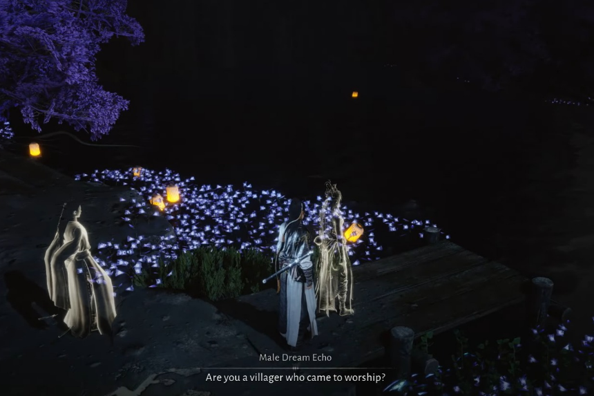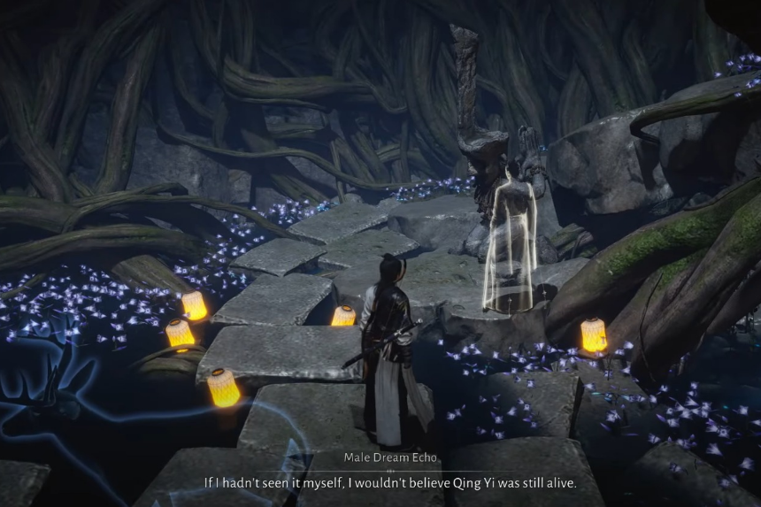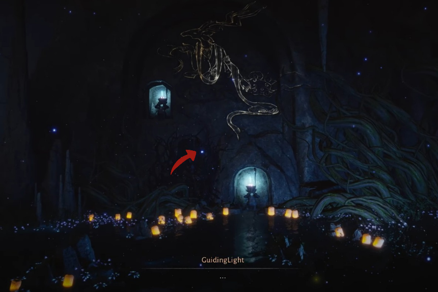 The last Echo lies across the water, and while it may seem like swimming or jumping over is an option, this won’t work. Instead, look closely at the set of pillars located near the water’s edge. Two pillars have faint glowing lanterns, which suggests a mini puzzle is hidden here. One pillar is still covered in vines—burn those away with fire arrows to reveal it. When the last pillar is lit up, the crossing will activate.