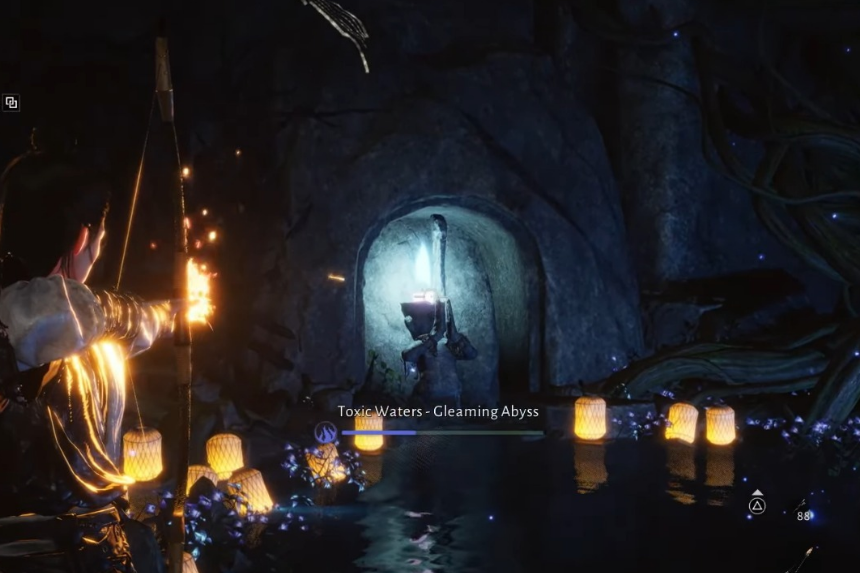 The last Echo lies across the water, and while it may seem like swimming or jumping over is an option, this won’t work. Instead, look closely at the set of pillars located near the water’s edge. Two pillars have faint glowing lanterns, which suggests a mini puzzle is hidden here. One pillar is still covered in vines—burn those away with fire arrows to reveal it. When the last pillar is lit up, the crossing will activate.