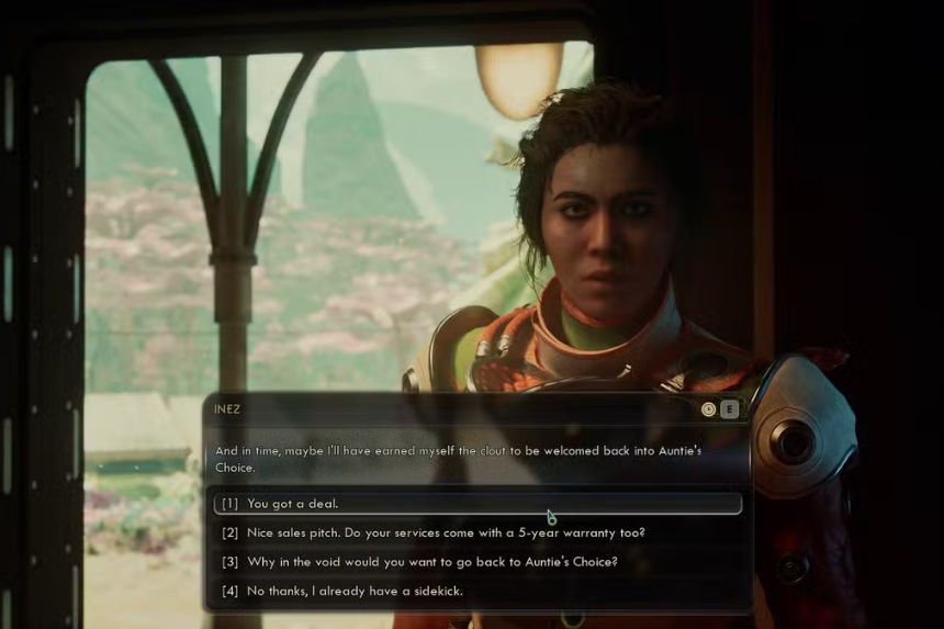 After completing your main objective in the area, return to the main settlement — you’ll find Inez negotiating her contract with Minister Milverstreet. Once the scene plays out, talk to her again, and she’ll agree to join your crew.