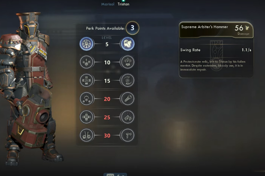 In combat, Tristan is all about brute strength. His Judgment ability lets him charge an enemy and slam them with a devastating blow that deals heavy damage and knocks back nearby foes. He’ll also taunt enemies afterwards, drawing their attention to him. His Supreme Arbiter Hammer is a unique weapon that doubles as both a melee weapon and a grenade launcher, while his Observant Adjudicator trait gives you a handy 25% chance to automatically spot hidden objects, even if your Observation skill isn’t high enough.