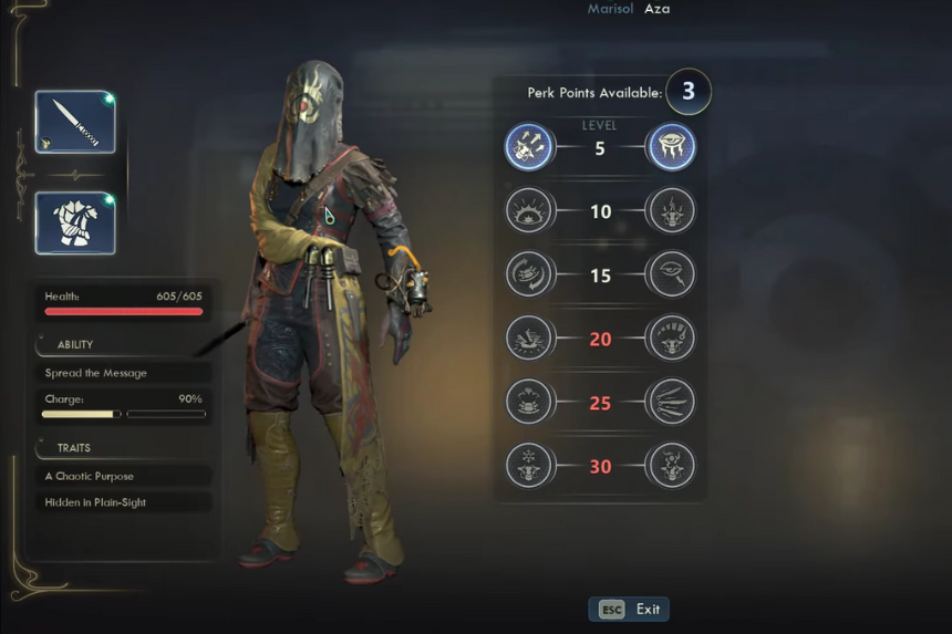 In battle, Aza uses her Spread the Message ability to launch an explosive charge from her wrist gadget, dealing heavy physical damage and staggering nearby enemies. Her A Chaotic Purpose trait lets her ability recharge faster than most companions, and she can even hold two charges at once. She also has Hidden in Plain Sight, which makes it harder for neutral or friendly factions to turn against you.