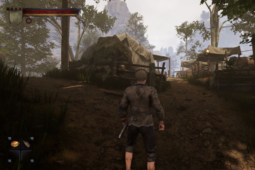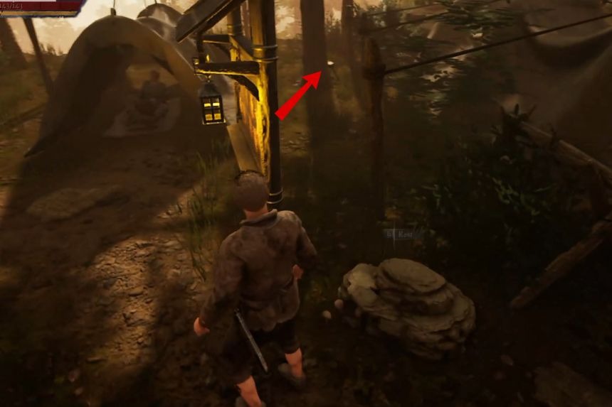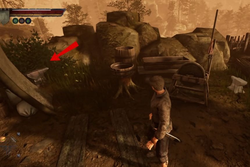 Then head towards the other side of the camp and you will find another anvil. Just to the left of it, behind a tree is Cyril’s hammer. As the hammer is found in the bushes, near the tree, you can easily miss the hammer if you don’t look carefully.