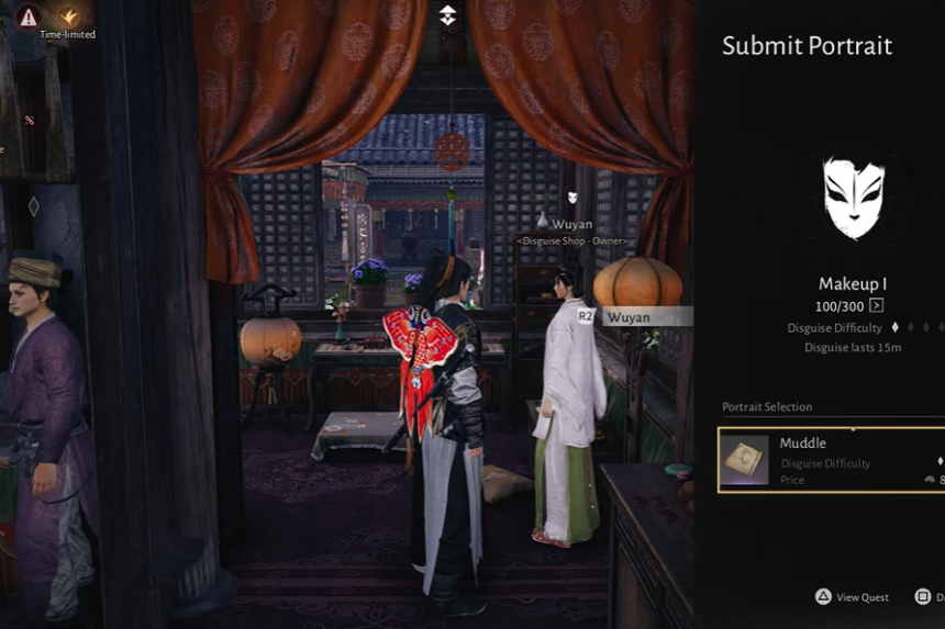 Once you finish drawing the portrait, follow the map to the icon that looks like a mask; that’s the disguise shop. Talk to the shop owner and pick the disguise you need. Since you now have Muddle’s description, you will be able to use it and move forward with the quest. Inside, speak to the person behind the counter and choose the option to put on a disguise. Select Muddle from the list so you’re wearing the correct one.