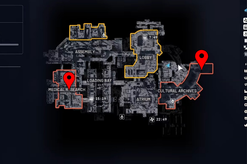 On the upper level, the Medical Research area also contains several Android locations. This part of the facility has a simpler layout and better lighting, which makes spotting both enemies and Androids easier, but it isn’t “better” in terms of spawn count — it simply offers clearer visibility and straightforward navigation, nothing more.