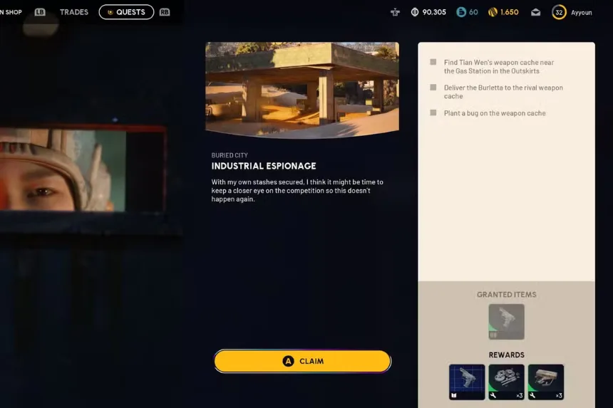 Industrial Espionage sends you back into Buried City to uncover Tian Wen’s hidden weapon stash. Location isn’t hard to reach, but surviving the trip-that’s the real problem, thanks to constant PvP traffic around the Gas Station and Hospital. After completion, it will reward a blueprint for the Burletta pistol, meaning this side quest is absolutely worth doing.