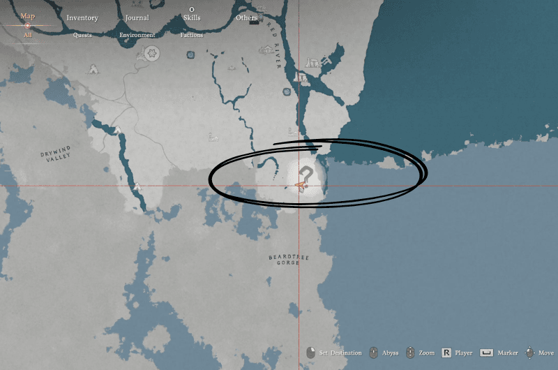 Head to this location on the map through the Red River where you get the Golden Greed Plate Armor Set and travel south towards Beardtree Gorge and you’ll see a question mark (point of interest) on the map when you get closer to the location, follow towards the mark and you’ll reach the Memory Laden Ancient Ruins.