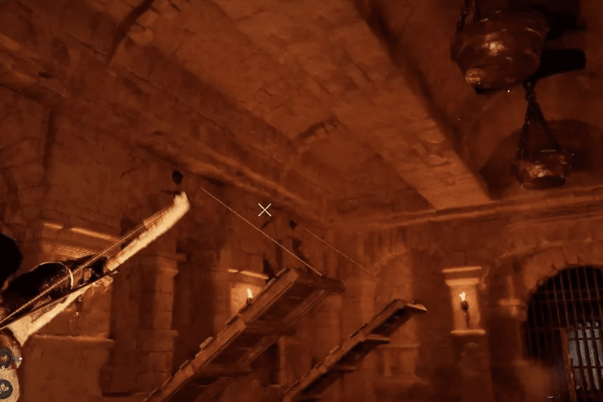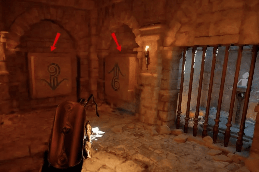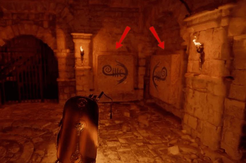 Go down the stairs to enter the dungeon. Inside, you’ll see targets on both sides.  Move forward carefully, and once you get past the tricky section, head over and open the cage door. Now you’ll reach the main puzzle. Here’s the order you need to follow:
