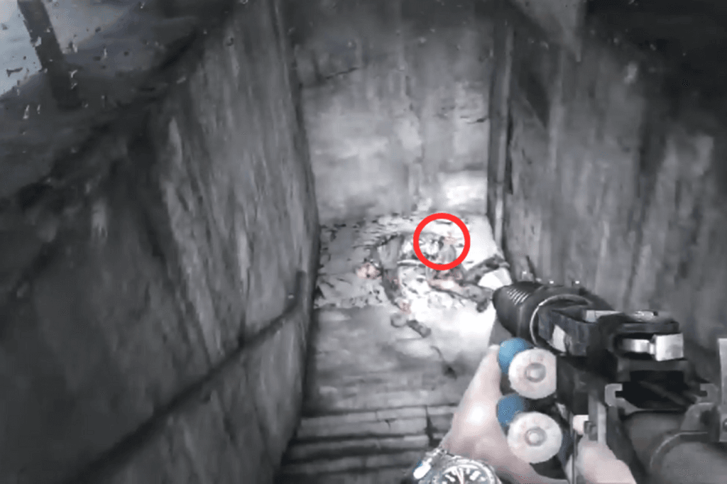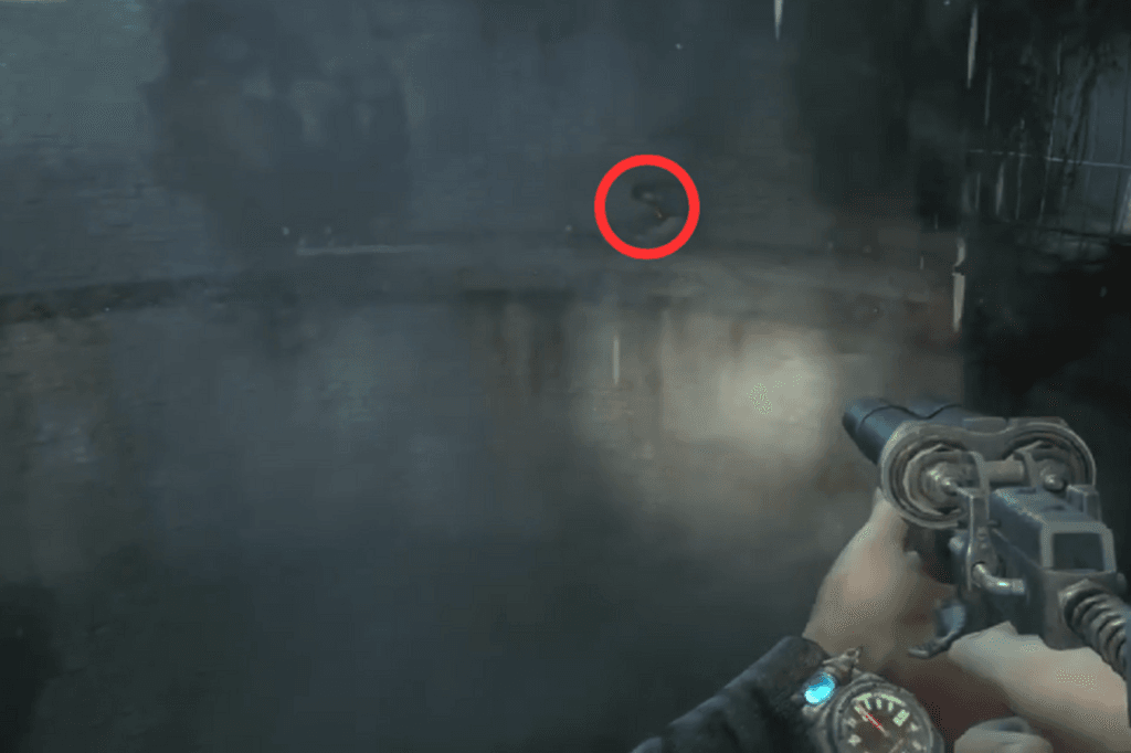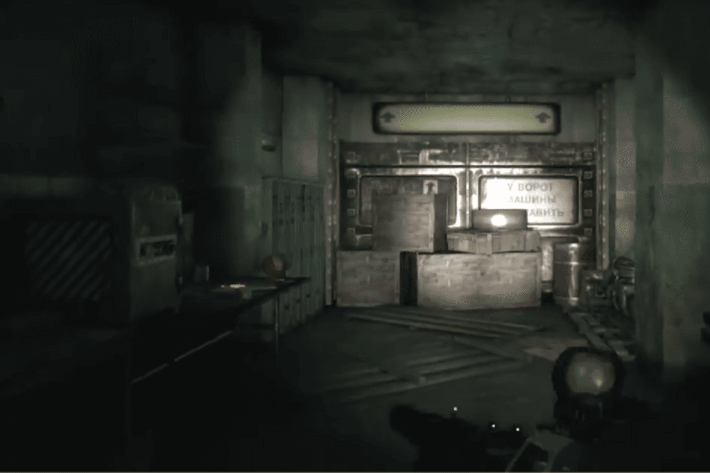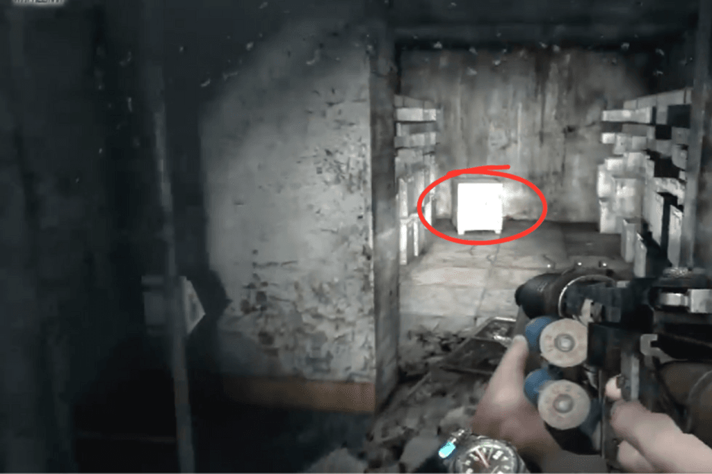 The first route is to jump down a hole. Once you’re down there, climb out through one of the smaller side holes, you’ll find a corpse nearby, so make sure to loot it. Once you’re on the ground, look to your left. You’ll spot some military-grade ammo sitting in a pool of blood. Carefully wade through the mildly radioactive puddles to reach the stairs. At the top, look to your right to find a shotgun and some ammo near another corpse, and to your left, you’ll see a door.