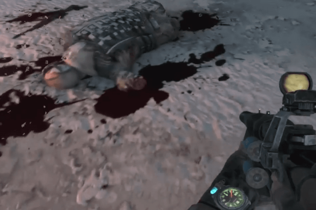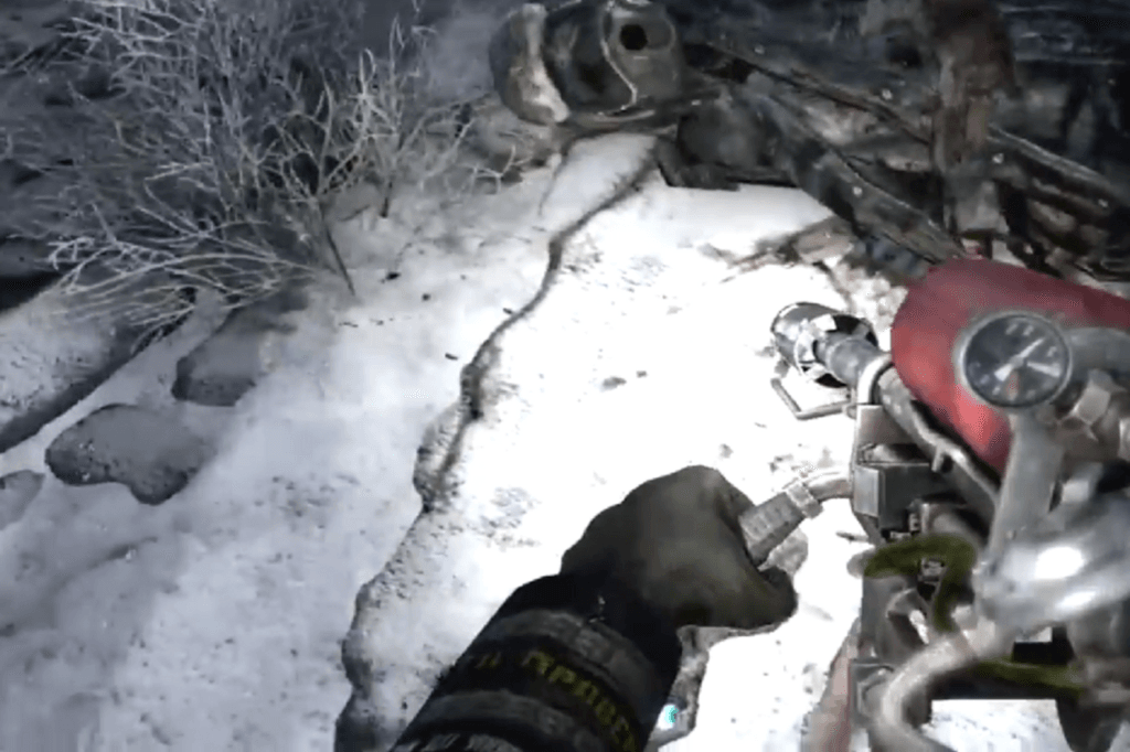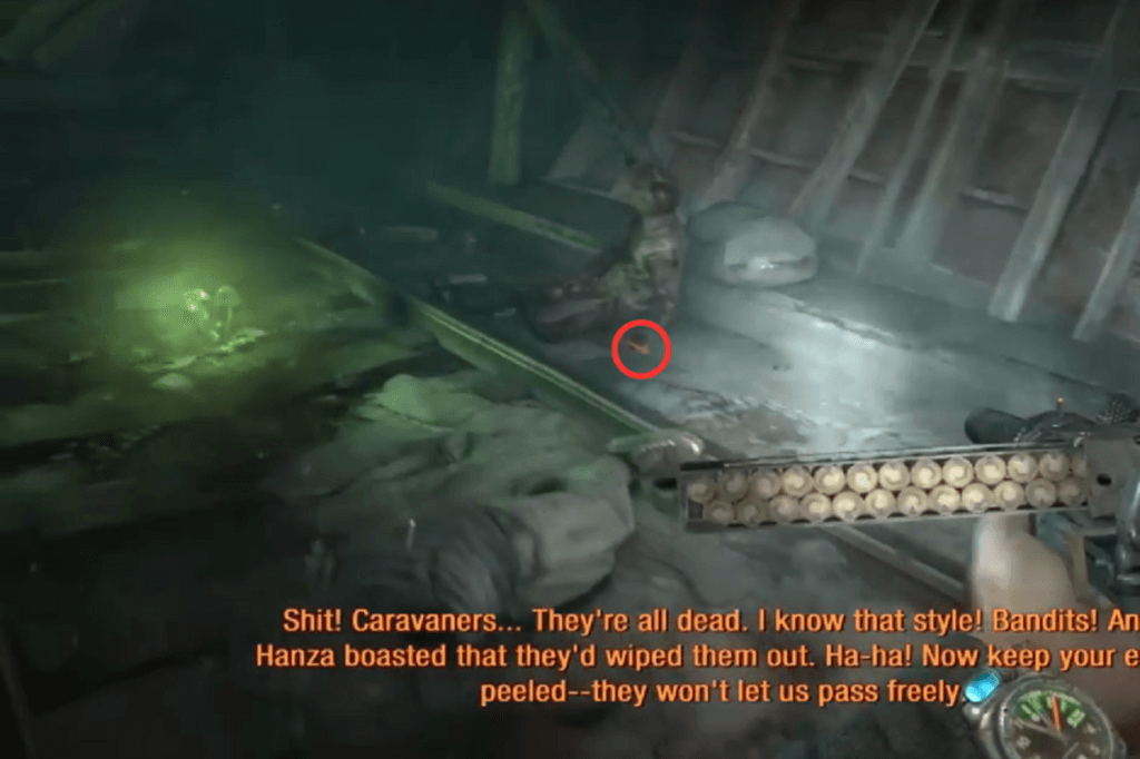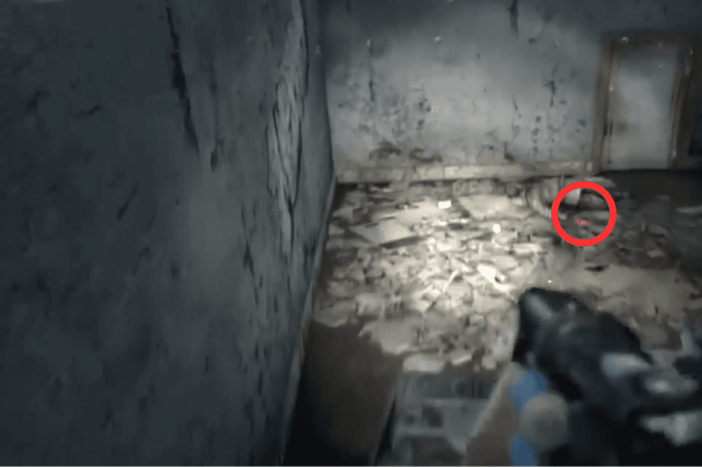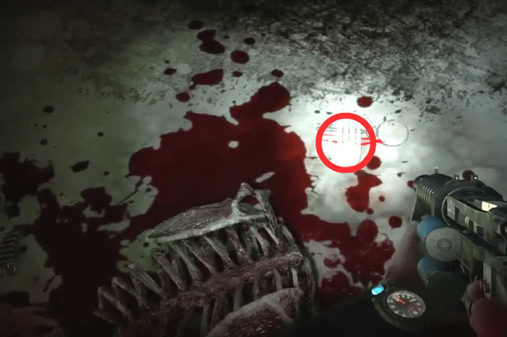 The first route is to jump down a hole. Once you’re down there, climb out through one of the smaller side holes, you’ll find a corpse nearby, so make sure to loot it. Once you’re on the ground, look to your left. You’ll spot some military-grade ammo sitting in a pool of blood. Carefully wade through the mildly radioactive puddles to reach the stairs. At the top, look to your right to find a shotgun and some ammo near another corpse, and to your left, you’ll see a door.
