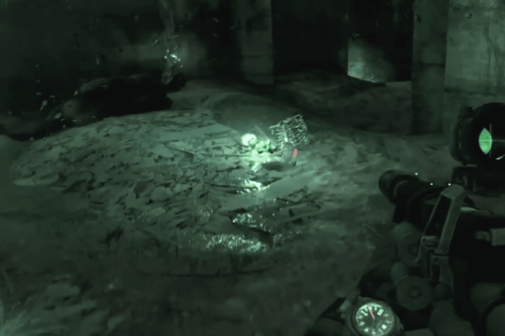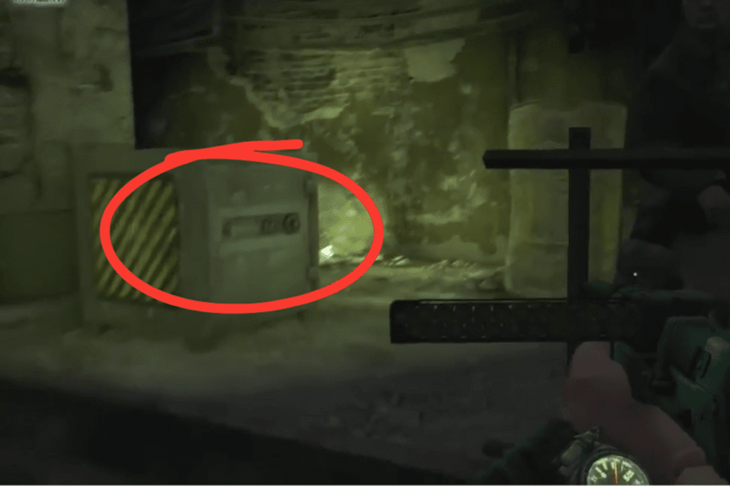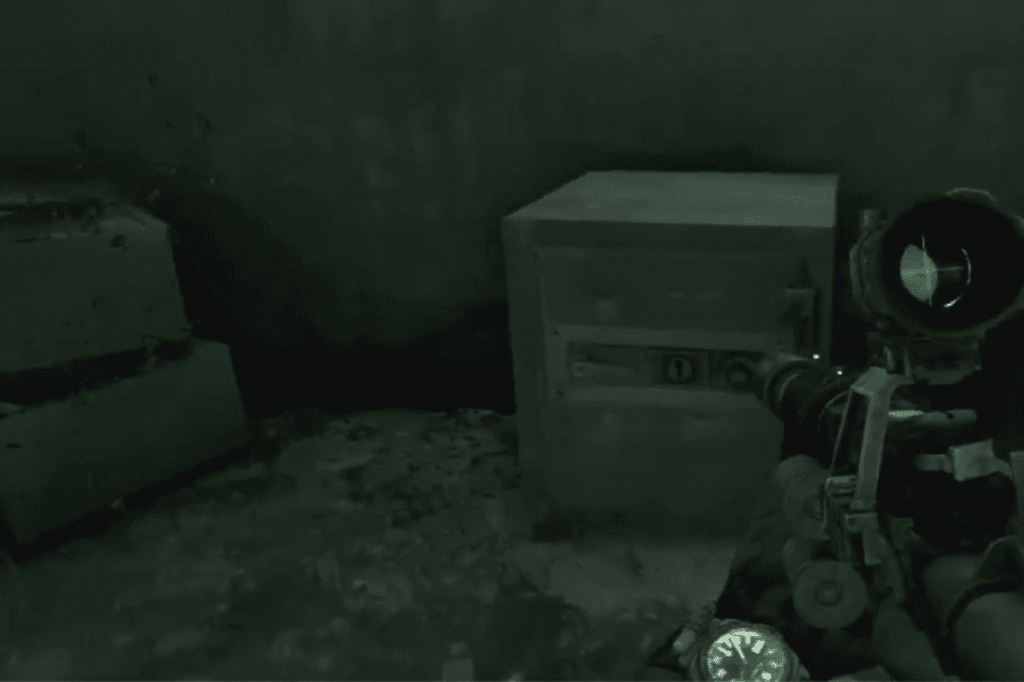 Go down the stairs, open the door, and follow the corridor to the end you’ll find the safe there. Next to it is a Bastard gun equipped with a night vision sight, heat sink, Kalash stock, and a laser sight. You’ll also find a pair of night vision goggles nearby, so don’t forget to grab those too.