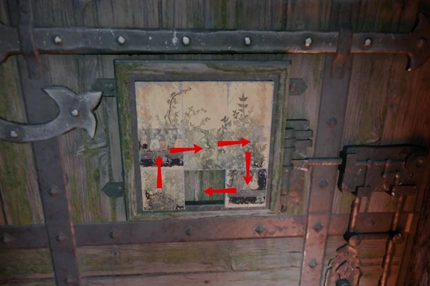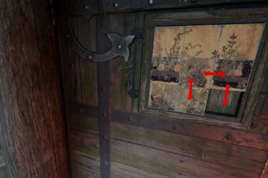 The final puzzle is located outside the cabin, and this one is attached to a door. Solve it the same way by following the correct pattern, and you will be able to unlock it easily. The second puzzle gives you a Guardian Alchemy Recipe.