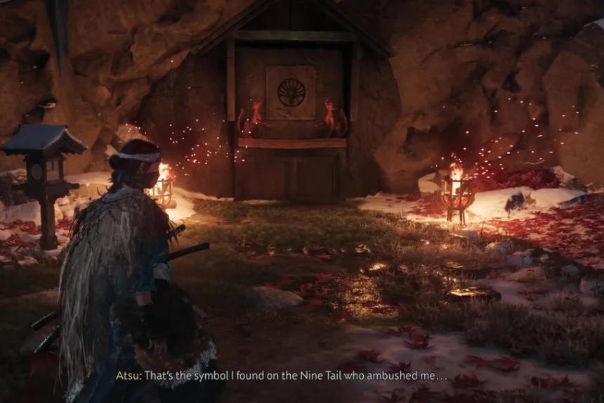 There’s a torch nearby; grab it. Your goal here is simple: light only the lanterns that have fox statues sitting on top. Once you do that correctly, a secret crawlspace will open beneath the shrine. Crawl through it, but be ready, another group of Nine Tails will ambush you inside. Defeat them and continue forward.