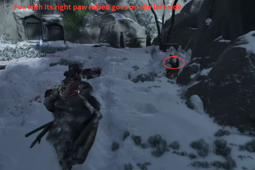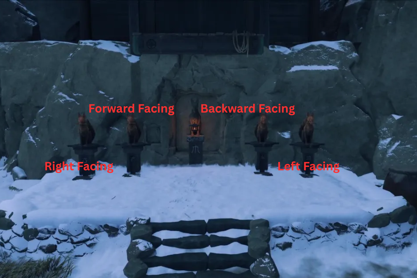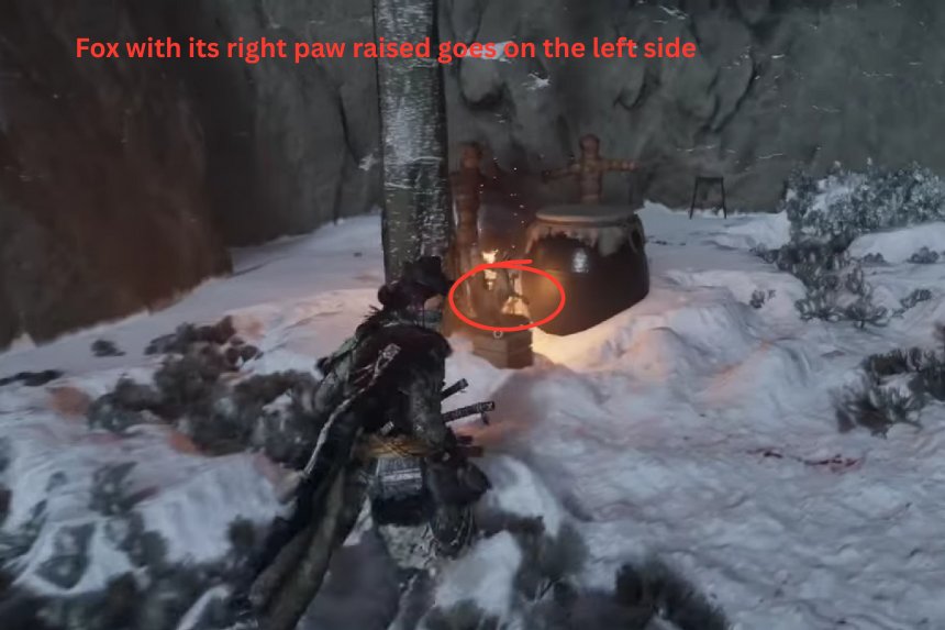 After the battle, you will find a large gate with two empty pedestals and several fox statues nearby. The statues have their paws raised; these are clues.