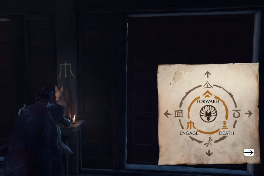 Take down all the enemies that rush you. Once the area is clear, return to the scroll and copy the cipher written on it by swiping the touchpad when prompted. The symbols might look complicated: