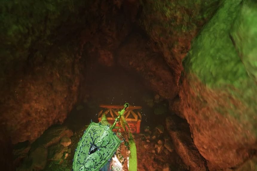 Go near the huge tree and activate Nature’s Grasp on it. While doing so, make sure to hold down the Space bar to increase speed and explore the vicinity. As soon as you approach the tree, you will notice the entrance to a cave near it. This is located very close to this place; thus, enter the cave to collect the North Wind Shield from inside the treasure chest.