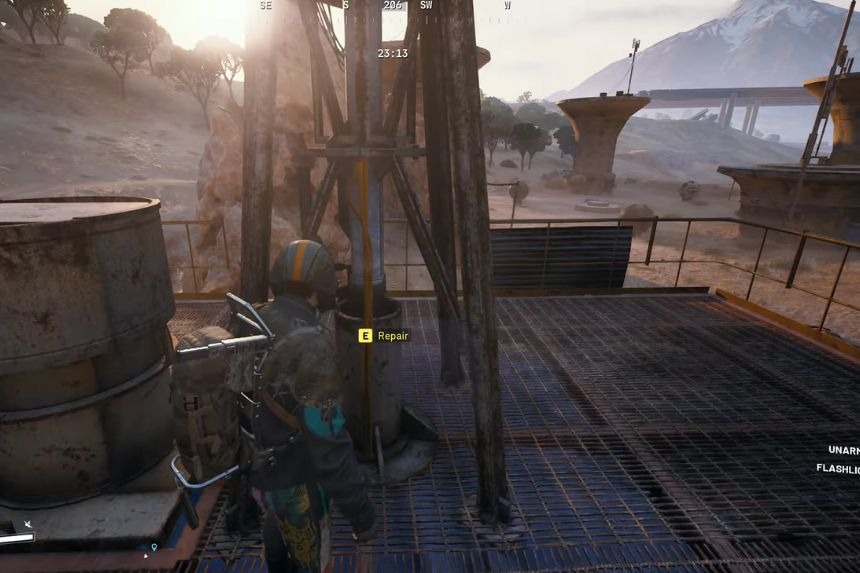 Once you’re ready, take a moment to scan the area. Other players or drones might be nearby, and it’s best not to get caught off guard. When things look clear, find the ladder attached to the depot and climb up to the roof. Interact with the antenna to begin the repair process, but be ready, fixing it makes a lot of noise and could attract enemies.