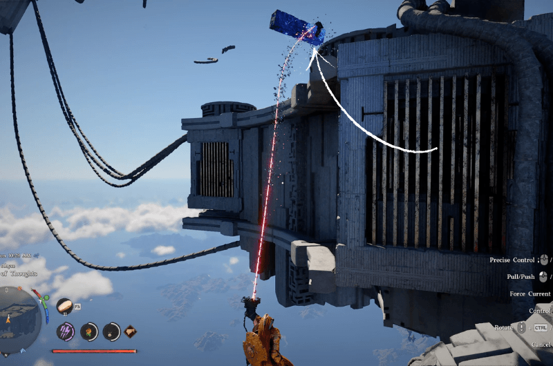 You’ll find the battery tucked inside a narrow space under the structure. Use Axiom Force on the battery to move it towards the deactivated wind turbines which are located on the structure that is beside the structure where you found the battery as shown in the above image.