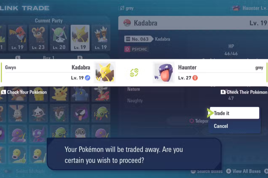 Trainers are able to select the Local or Far Away options based on if the partner with whom they will be trading is close to them or online. Both parties will have to enter the same eight-digit trade code in order to create a session. Once the trade of Kadabra is done, it will automatically evolve into Alakazam. If trainers want to restore their initial Pokémon after the trade, they will have to open another exchange.