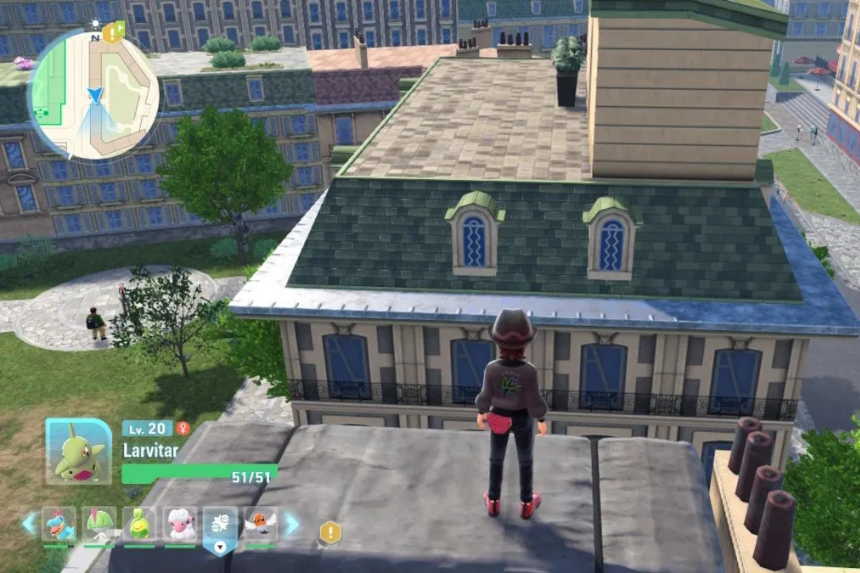 Larvitar is located in Vert Sector 2 and Bleu Sector 7 of Lumiose City. These are some of the final areas to explore in the city, so be prepared to judiciously hop from roof to roof. To access the roof in Vert Sector 2, ascend the ladder in the northern courtyard and proceed south. You may need to scale boxes and roll off edges to get across gaps to where Larvitar typically resides in some bushes. It’s a Rock/Ground type, so be careful not to slip!