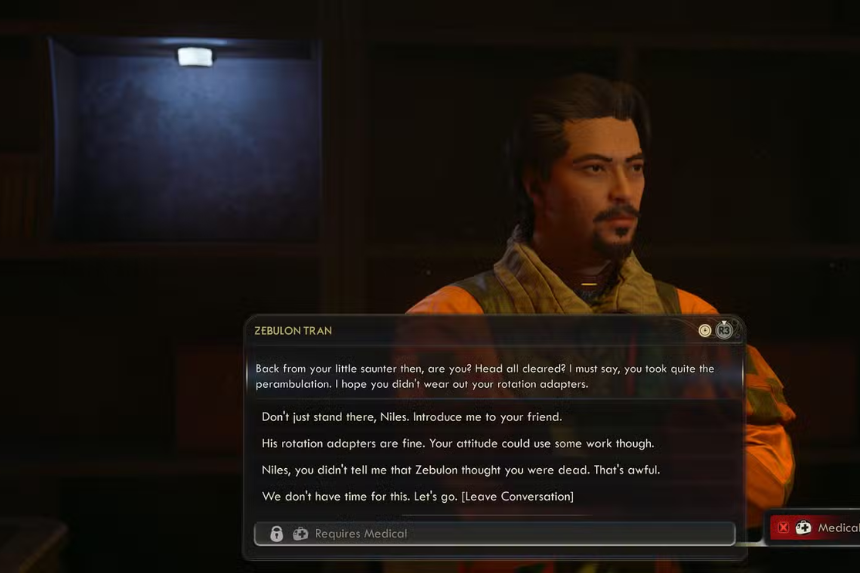 As you’re about to go, Zeb instructs you to use his call sign so that the Subversives will know you’re with them. The twist? He never actually tells you what it is — but Niles already knows. So you have to bring Niles with you on this mission.