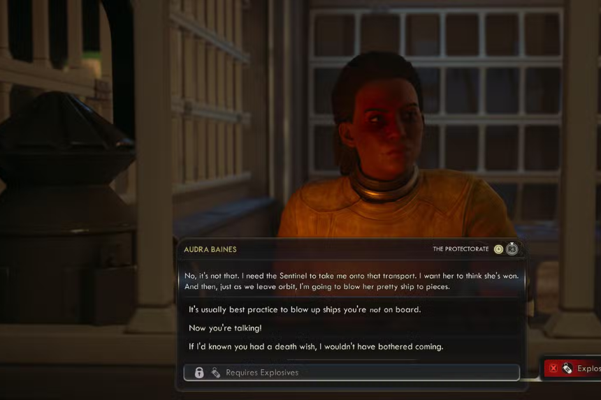 You can also get a guard who has the key to the cell, but even when you open it, Audra will not leave. After saying her final thank you, the ship explodes — destroying her, and the Protectorate officers, along with it.