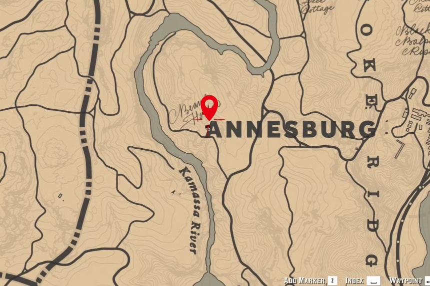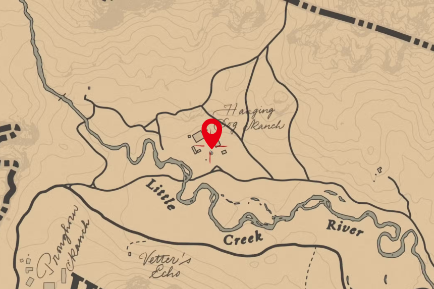 You’ll find Hanging Dog Ranch just north of the Little Creek River. Depending on where you are in the story, it’s controlled by either the O’Driscoll Boys (Chapters 1-6) or the Laramie Gang (in the Epilogue). This place is crawling with enemies, and one of them even mans a Gatling gun in the barn window so be ready for a tough fight.