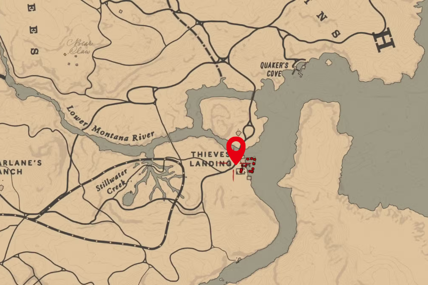 South of Blackwater, right on the border, is Thieves’ Landing, a settlement completely overrun by the Del Lobo Gang. They’ve turned it into a hub for their criminal dealings, and the whole place feels hostile the moment you arrive.