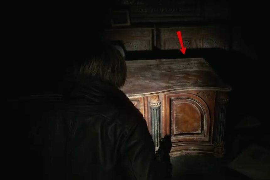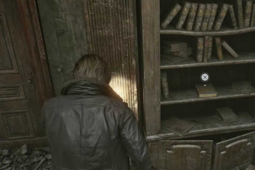 Leave the armoury room and turn right to the nearby room. Inside this room, check the drawer, and when you open it, a note will fall down. If the note doesn’t fall, try shooting the drawer to make it fall. Next, exit the room and go to the library. Once inside, go to the stairs on the right side and climb to the upper floors. At the top of the stairs, look to the right side to find a book that you can interact with.