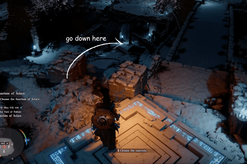 Turn around from the sanctum and you can see a path to the lower level of the ruins. Go down at the pointed location.