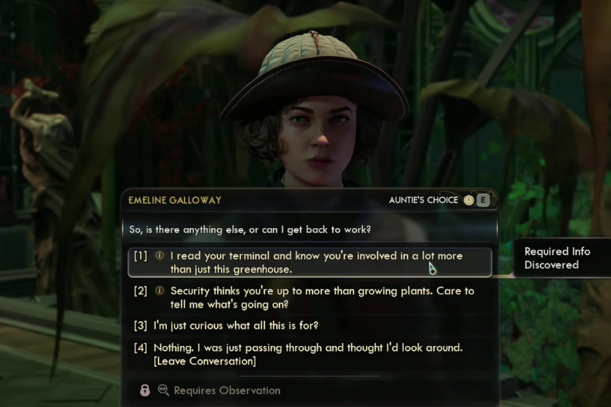 Alternatively, if you’ve unlocked Hack 2, you can trick Cardosa into thinking you’re a specialist there to check the security of her terminal. Follow the same dialogue setup as before, mention you’re not with Auntie’s Choice, then say you have a private matter and would like to look at her terminal. When she asks why, use the Hack 2 line that says, “Emeline Galloway asked me, a specialist, to ensure your terminal’s security is up to date.” This will convince her to trust you, letting you take the keycard without issue.