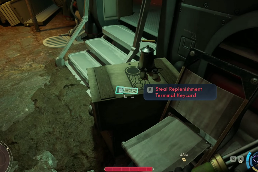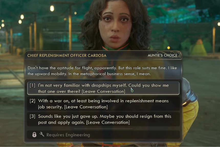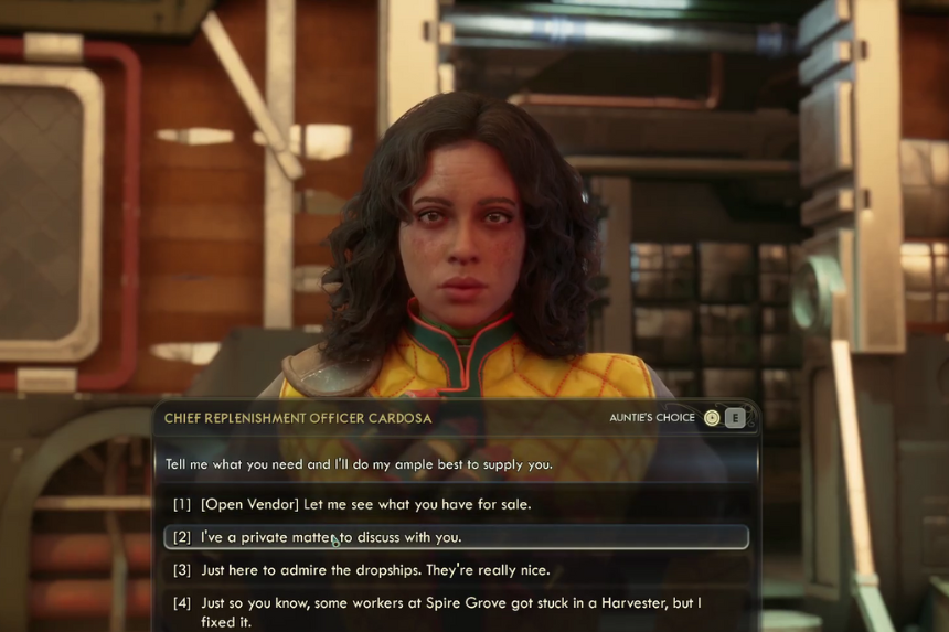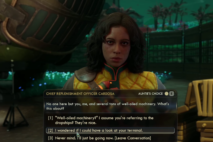 If you don’t have any skill perks, the easiest way to get the keycard is by distracting Cardosa. Start by talking to her and choosing dialogue options that make her look away. Tell her you’re interested in new accoutrements or mention that you’re not officially with Auntie’s Choice. Then, comment on how nice the dropships look, ask what’s stopping her from pursuing her dream, and finally, say you’re not familiar with dropships and ask her to show you one nearby. Once she walks toward the ship, wait until she’s not looking and no one else is around, then quickly get the keycard.