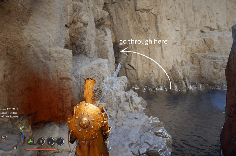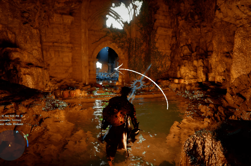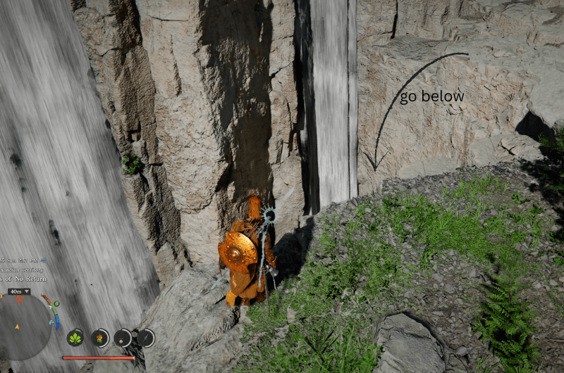 Identify the stone structure as shown in the above image, then from that point get near the waterfall and use stab skill to enter the cave. Follow the path inside and you’ll come across a treasure chest with the Scorchflame Plate Gloves.