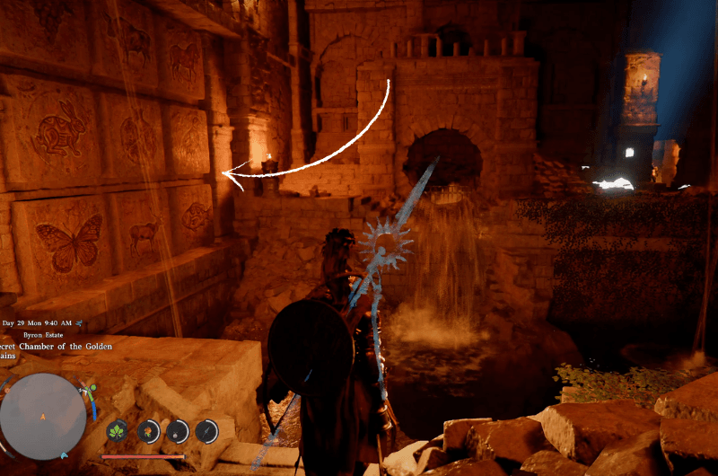 After you go through the entrance, you’ll reach the Secret Chamber of the Golden Plains and you’ll see the puzzle on the left side of the wall.