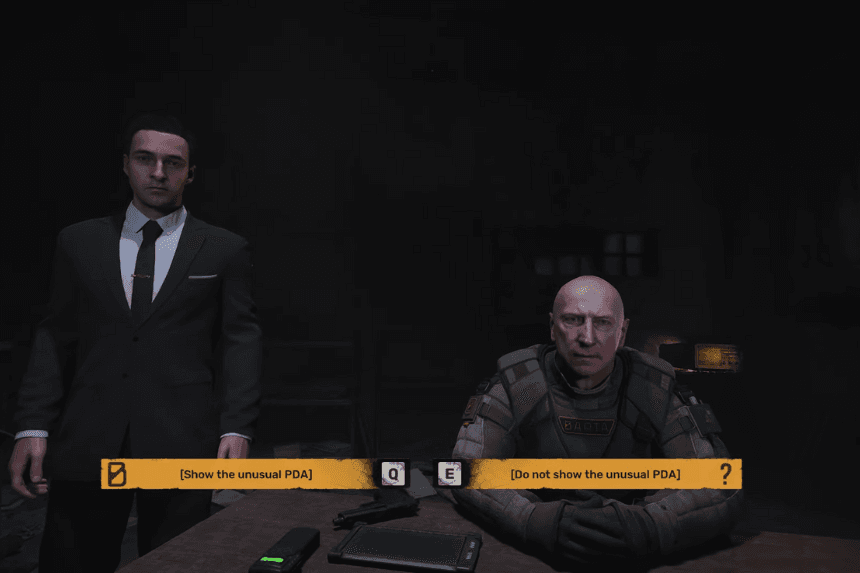 Dr. Dalin knows about the Scanner business, a secret project you’ve been involved in. During the interrogation, you’re given a choice: you can either show or hide a special PDA you got from the body of The Last One. Your decision will have important consequences later in the game.