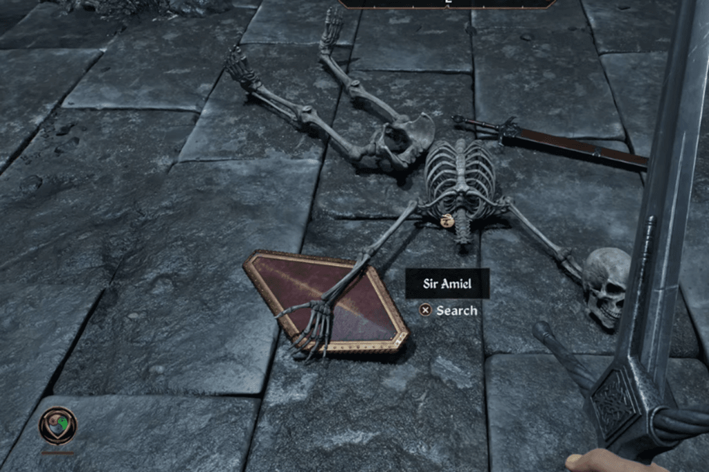 In the second part of the ruin, called the Shrine of the Crusader, you’ll discover the body of Sir Amiel, a fallen knight. He’s carrying a Fine Steel Longsword and a Knights of the Nine Shield. When you search his body, you’ll find his journal and a special ring. Reading the journal reveals that Sir Amiel was actually the leader of the Knights of the Nine. His writings explain that the group fell apart due to greed and infighting, as some members wanted to use the relics for their own power instead of their true purpose.