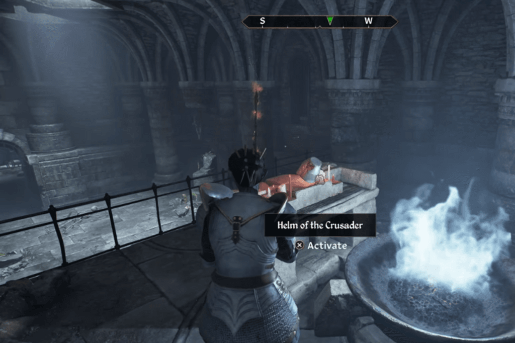 Keep moving through the Shrine of the Crusader and into the Lost Catacombs, it’s a short but monster-filled path that eventually loops back up to the upper part of the Shrine. There, you’ll find the Helm of the Crusader sitting on an altar, high up on a ledge overlooking Sir Amiel’s body. Grab the Helm to complete this part of the quest.
