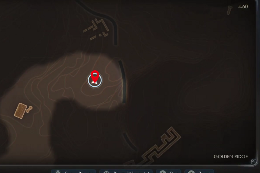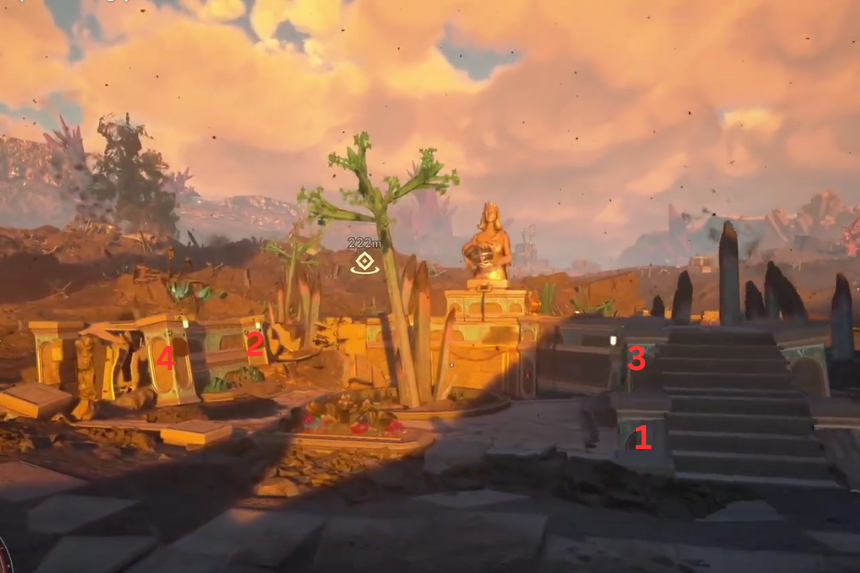 Northeast of Scrapper’s Den, you will find a ruined memorial with a statue and four plaques on the ground. Interacting with the plaques will raise the statue and reveal a hidden door underneath.