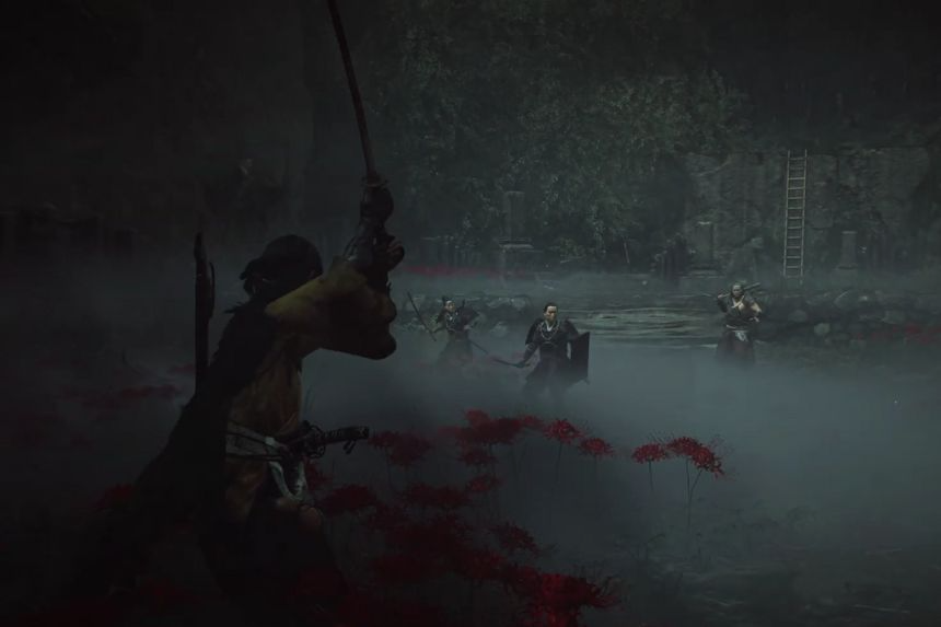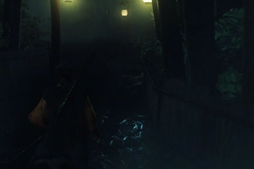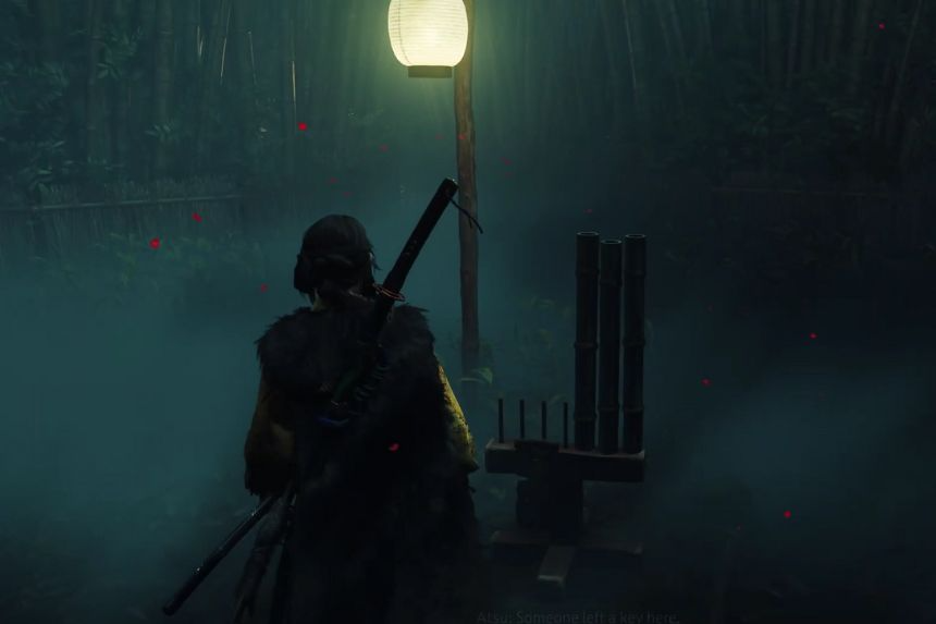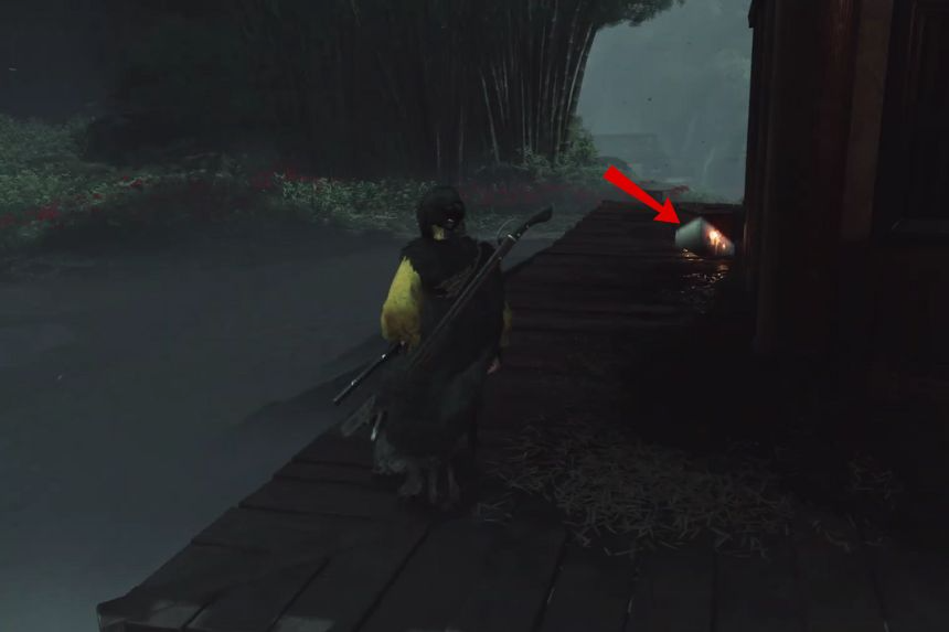 Head back toward the main locked gate. This time, turn right and move past the nearby building until you spot a tunnel ahead. Inside, you’ll notice a bamboo strike. To get the key here, follow the trail of red spider lilies that lead toward a glowing light. Each time you step into the light, you’ll be teleported back to the tunnel’s entrance.