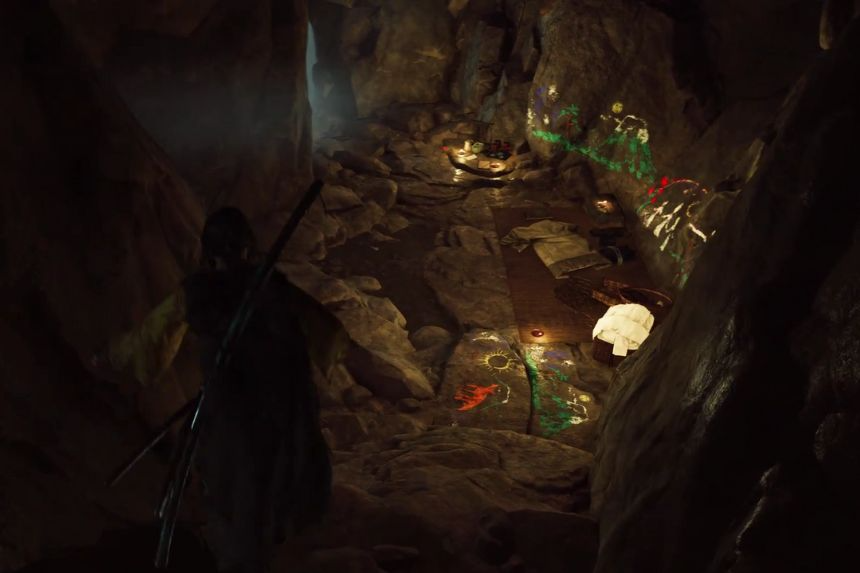 Continue forward, cross a log, and you’ll eventually reach a large chamber. Here, you’ll hear voices belonging to General Tominaga and a Saito outlaw. Look around the area, you’ll find a painted wall, several items, and the Cave Key placed among some lit candles.