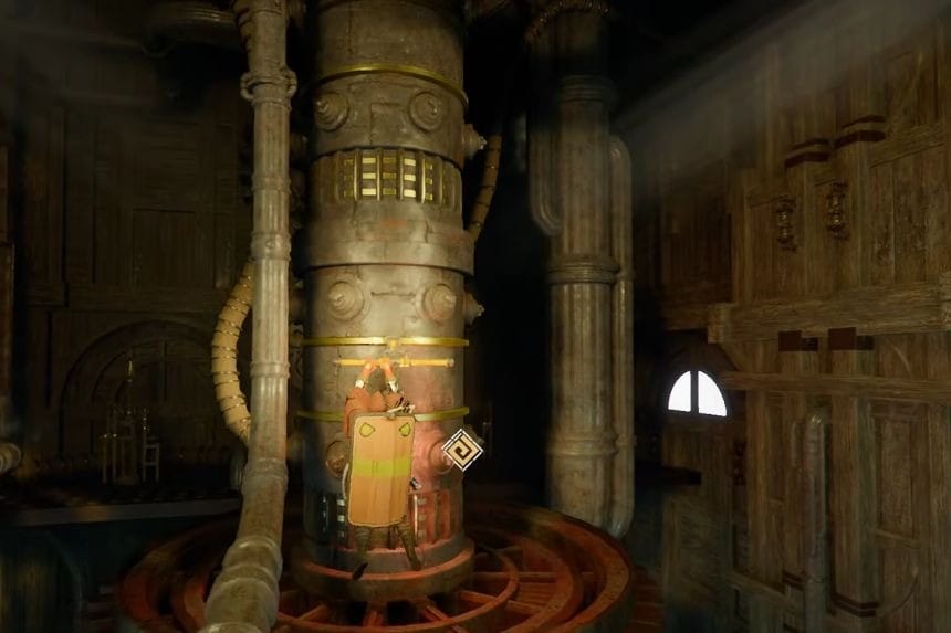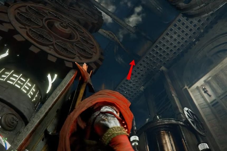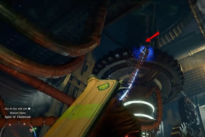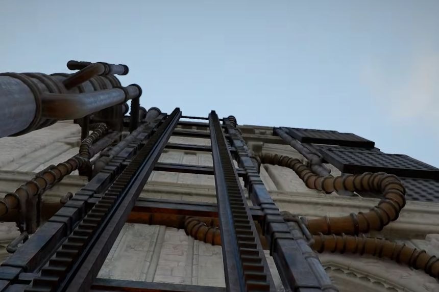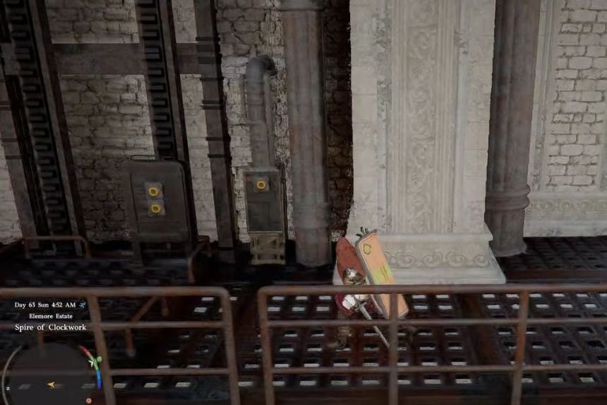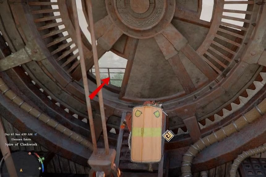 Keep moving up, and you’ll find another platform. Just focus on hitting the middle. Pull the lever there and continue climbing. Be careful when you reach the stairs section. There’s a glitch where you can get stuck underneath them. To leave the spire, go through the opening in the rotating clock face. Once you’re out, take a right, and you’ll find an elevator waiting for you there.