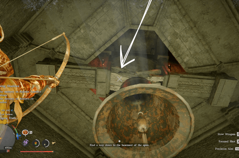 Shoot the wooden plank that’s holding the bell, then the bell will drop down on the ground, breaking it in the process and the path to the basement is now open.