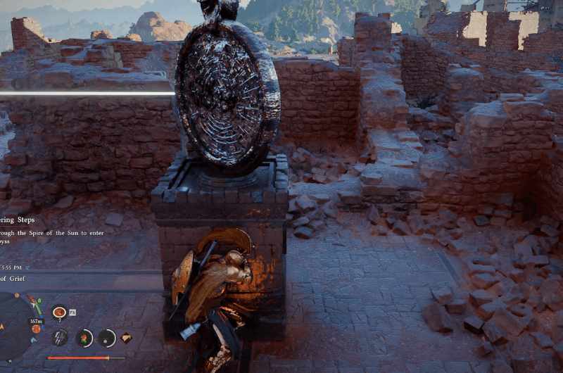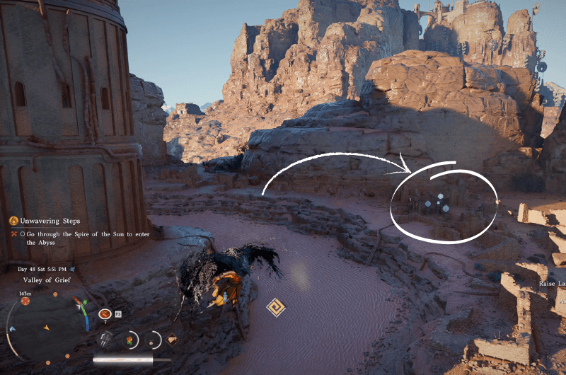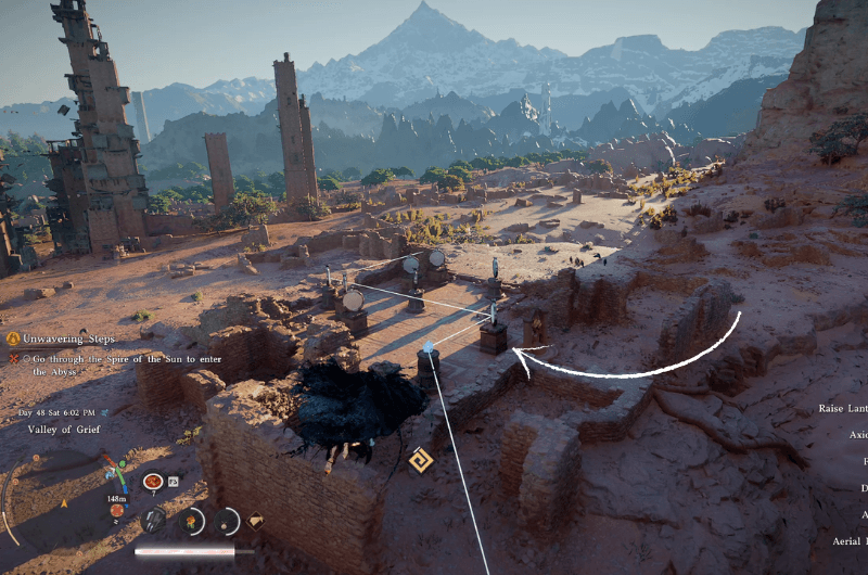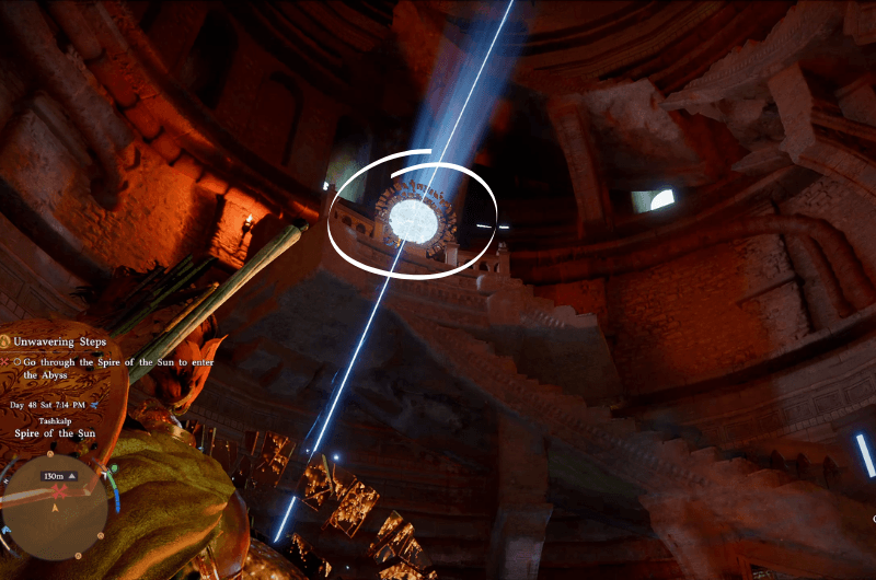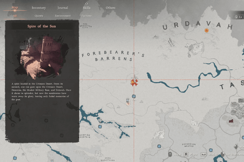 Head to the above location shown on the map which is to the north of Burhum Town in Crimson Desert region. The Spire of the Sun cannot be accessed until you have progressed to Chapter 9 of the main questline. And the spire is locked with a mirror and light mechanism that must be solved in order to gain access into the Spire.
