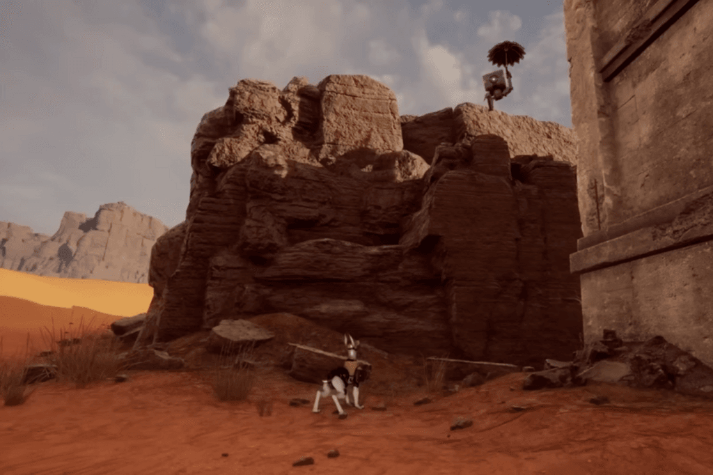 When you arrive, you will find out that Volt will be barking at a Box Robot that is hovering on the edge of a high platform. Place the yellow box close to the broken bridge pillar, which is concealed by a nearby boulder, to get there. This will allow you to climb using the handlebars.