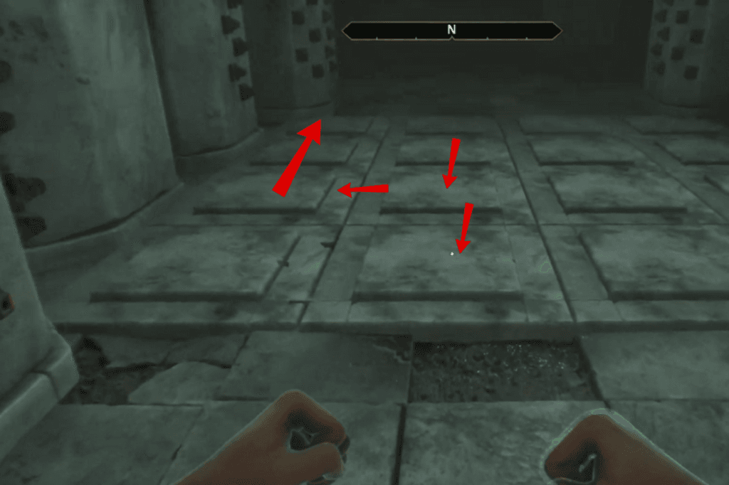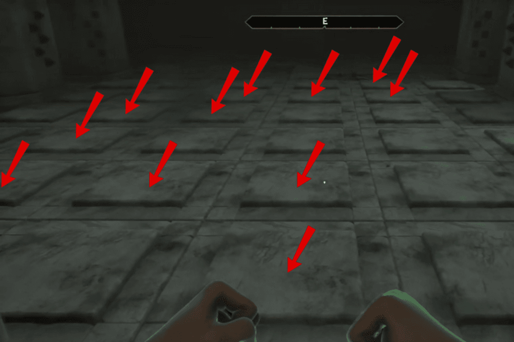 Now, if your Acrobatics skill is high enough, you can jump over some of the pressure plates. Feel free to do that. Just remember there’s no bonus for stepping on the correct plates, but there is a penalty if you step on the wrong ones. Missing steps trigger arrow traps.