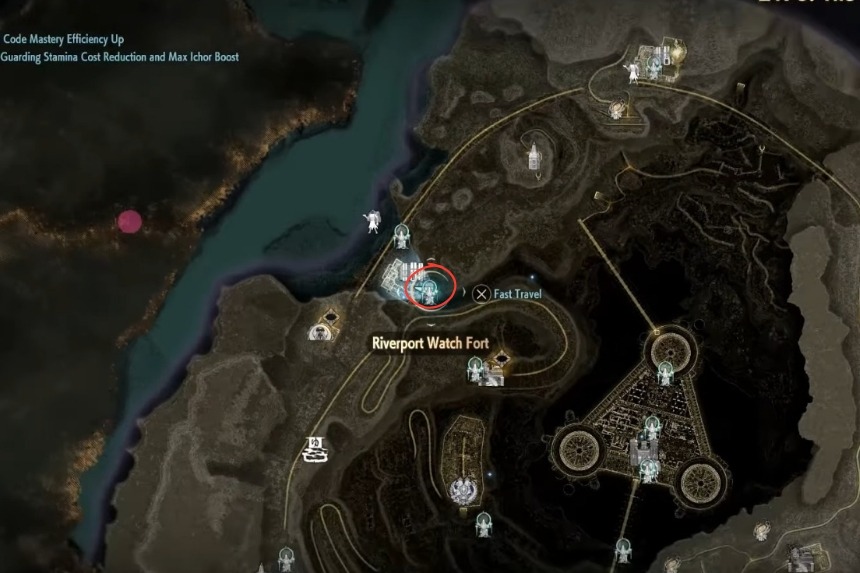 The first Golden Blood Bead, you’ll need to fast travel to Riverport Watch Fort. Once there, pass through the fort using the staircase and head outside. Turn right, and you’ll come across the Hidden Riverside path. Keep following the path, and you will come across the Tower of Regeneration, where you’ll find the cat statue.