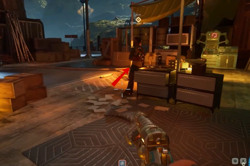 Once you start The Curious Case of a Cankered Chief quest, your first step is to find Security Officer Abner. He’s standing near a Vending Machine and a Workbench, just to the left of Bardot’s cell. Talk to him, and he will ask what you’re doing inside the fort. You will get a few dialogue choices; pick either the first or second option to keep the conversation going.