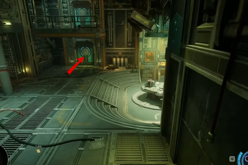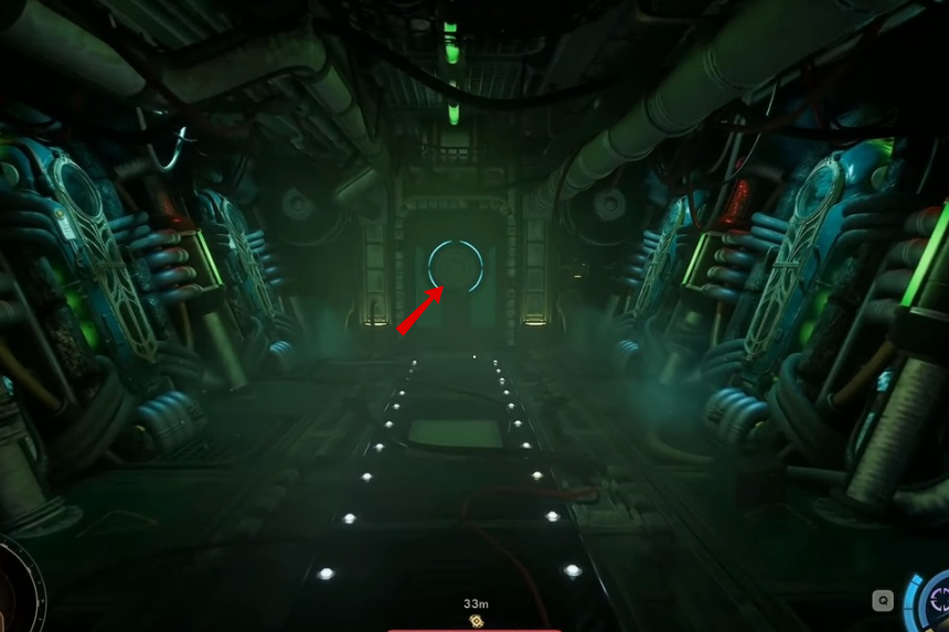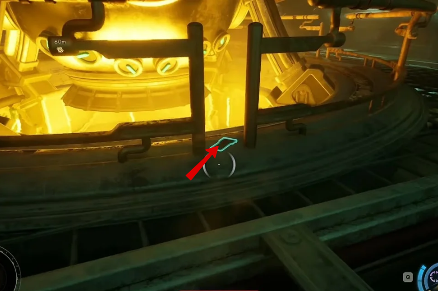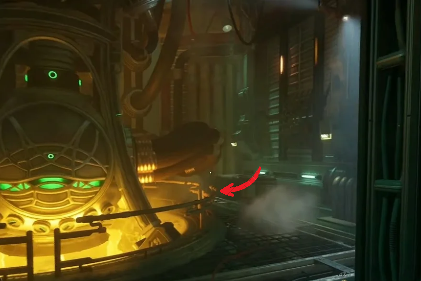 Once you step inside, stick close to the engine and move around behind it. There are some pipes in the way, so be ready to crouch and go through a narrow gap.